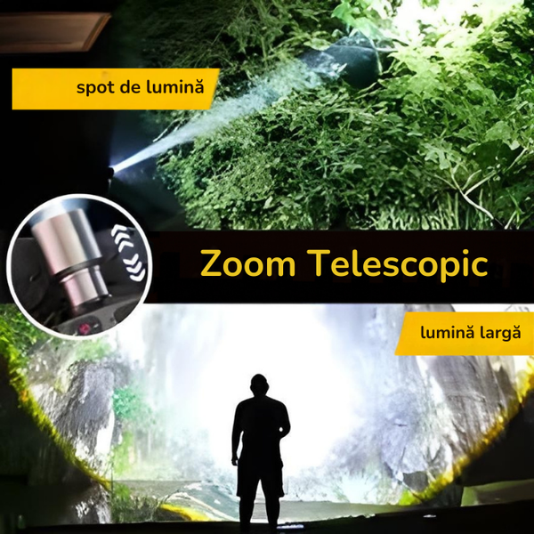 Da, zoom-ul telescopic ajustează fasciculul de la focalizat la larg, potrivit pentru orientare pe distanță sau iluminare de aproape.